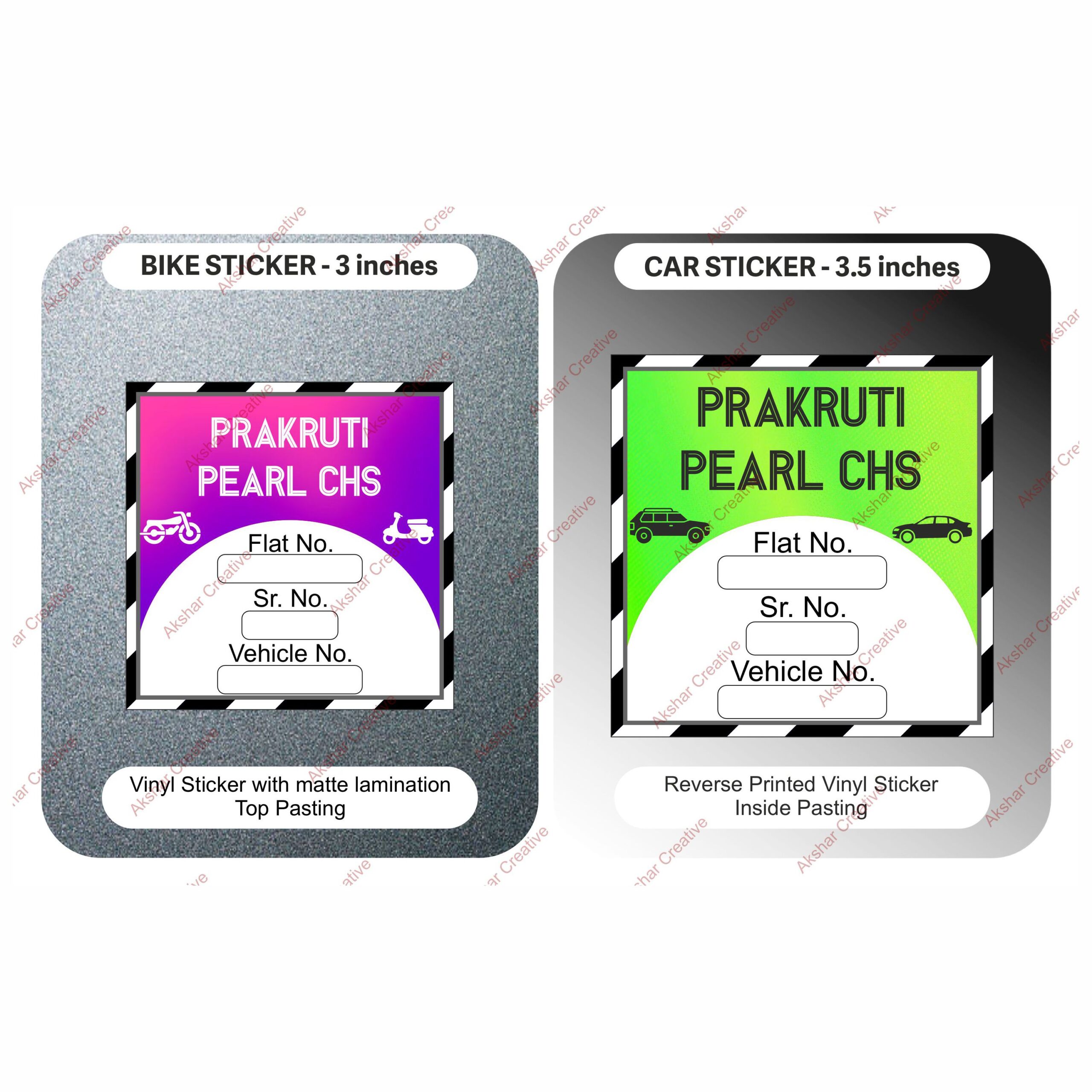 Bike Stickers Design Only 48 Pieces, Bike Stickers with flat number/others 48 Pieces, Bike Stickers with serial number 48 Pieces, Car Stickers with design 30 Pieces, Car Stickers with flat number/others 30 Pieces, Car Stickers with serial number 30 Pieces |